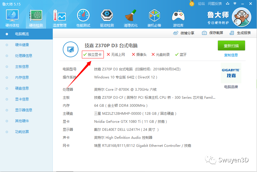 很多软件包括Dragonfly的运行环境都对电脑硬件有一定要求,没有独立显卡的电脑几乎不能正常使用这些软件,如何查看电脑是否有独立显卡呢?可以使用鲁大师、驱动精灵等第三方软件检测电脑是否安装了独立显卡。
