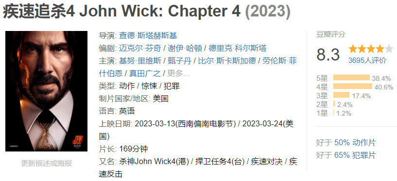 在豆瓣平台,《疾速追杀4》也拿下了不错的口碑成绩,最新评分为8.3分,四星好评占比最高,约为40%。