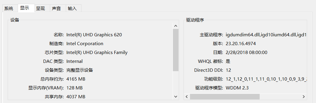 2、切换到“显示”,就能查看显卡的芯片型号、显存大小(1024MB=1GB)等配置信息。