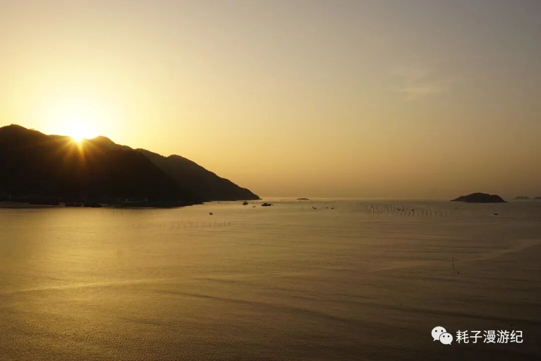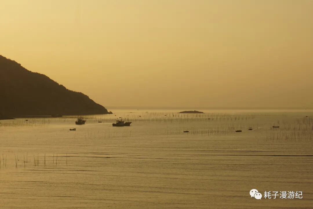 三沙光影栈道有两公里多,是从小晧到东壁铺设的沿海栈道,分为三个入口,西入口在小晧,东入口在虞公亭大桥(东壁),这里也是最佳的日落拍摄地,而北入口拥有视野最宽阔的观景台,因此旅游大巴都停在这里,导致该路段有些堵车。我们从北入口下栈道,往东走,这里的海岸线有完美的C型,而捕捞网和零星的渔船又填补了海面的留白,增添了画面的美感,瞬间明白为何霞浦能成为经典的摄影地。遗憾的是中午还是晴空万里,此时却已形成了云层,且有蔽日之势,一路追着逐渐暗淡的日光,在虞公亭大桥依旧没有看到日落,只拍到云层间那一抹吝啬的余晖。