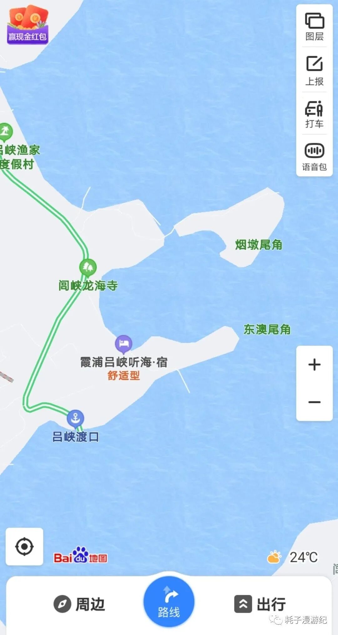 今天主要走东线,另外加入了下尾岛这个相对比较远的独立景点(敲黑板:在百度地图上直接输入下尾岛给出的地点是错误的,要输入吕峡渡口四个字,东北方“烟墩尾角”所在即下尾岛,如下图)。霞浦县城距离下尾岛有45 km,坐班车大约1 h。