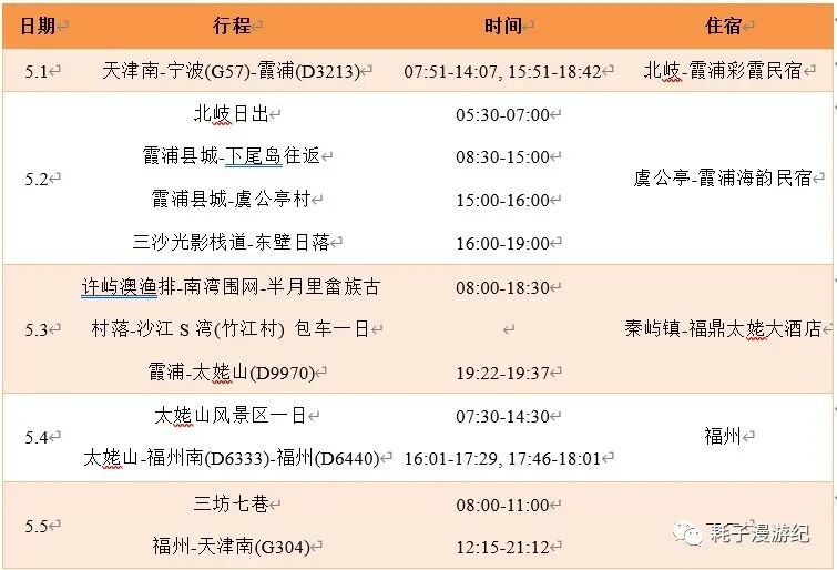 疫情后的第一次出行选择了福建霞浦,主要是考虑到海边的人流比较分散,而且也是毕业十年后的江湖再见,天南地北的几个人聚在了这个折中的旅行地。行程路线见下表: