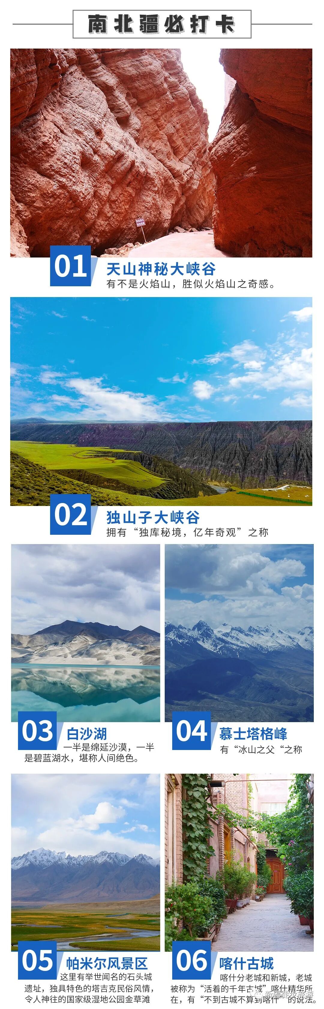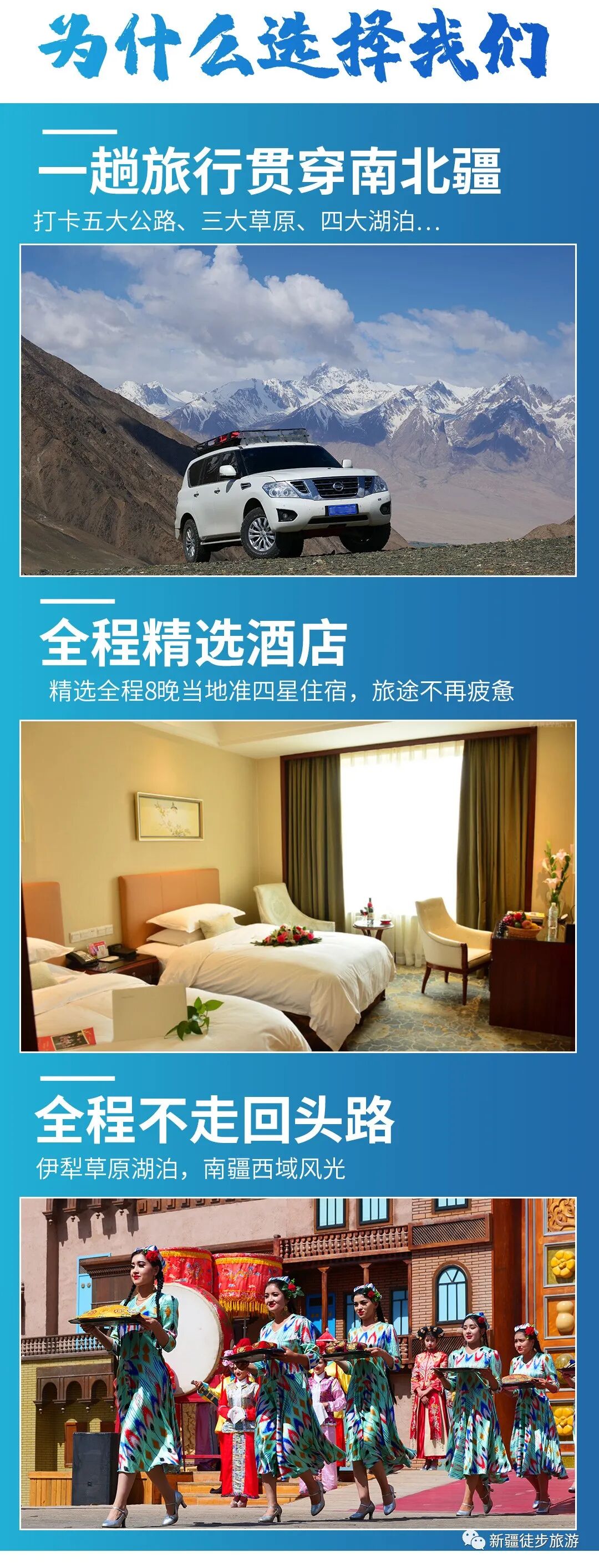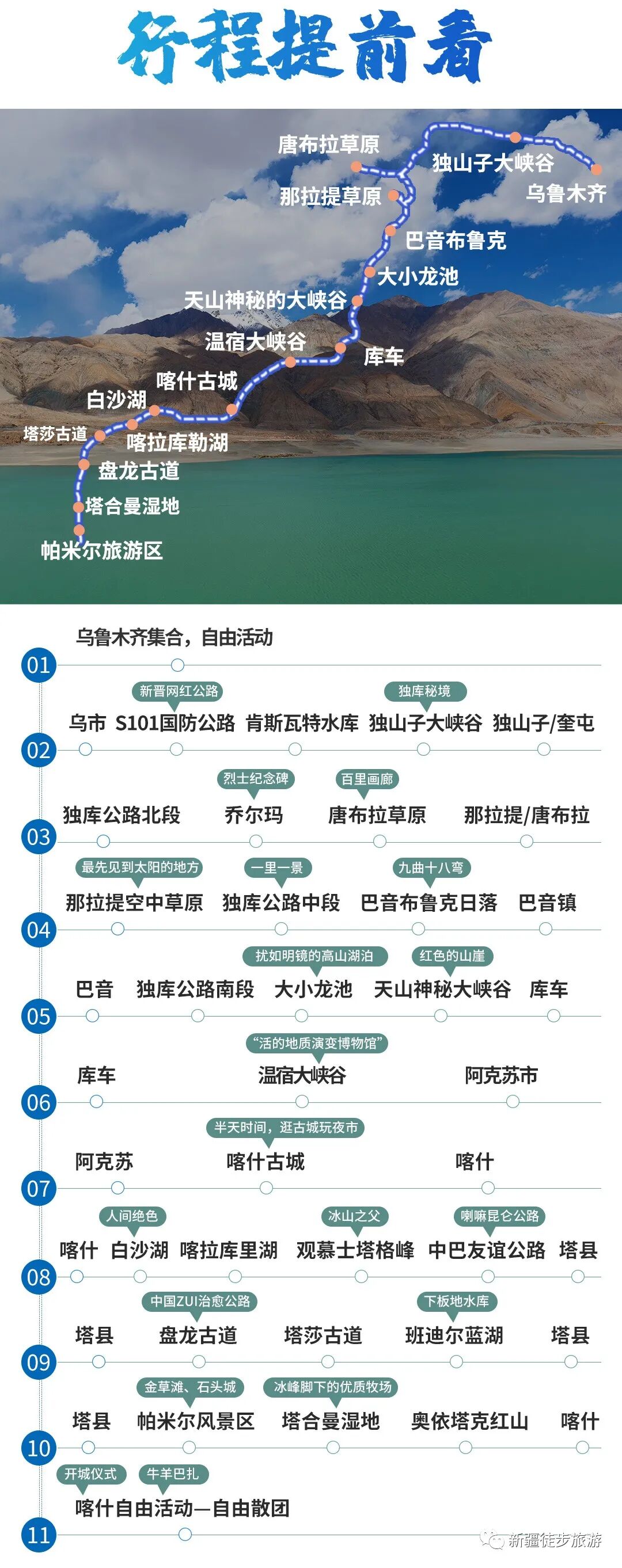 详情行程 01 乌鲁木齐集合 乌鲁木齐是世界上离海洋最远的城市,是亚洲的地理中心,亚欧大陆的桥头堡、有优美的牧场之称。乌鲁木齐作为新疆的第一站,可以根据自身航班落地时间自行安排游览。国际大巴扎和新疆民街都是不错的打卡点,逛一逛富有地域特色的乐器店,尝一尝当地的坚果美食,逛累了就去红山公园看看日落,红山塔的旁边还可以挂上同心锁;或者去二道桥大巴扎的老茶馆静心闲坐,度过第一天的集合时光。 重点推荐: 【新疆国际大巴扎】新疆西域大巴扎是新疆规模较大的大巴扎,大巴扎(维吾尔语,意为集市、农贸市场),集伊斯兰文化、民族商贸、娱乐、餐饮于一体旅游文化综合体,是新疆旅游业产品的汇集地和展示中心。 【红山公园】位于市中心的地段,让山顶上的远眺楼成为俯瞰整个乌鲁木齐市区的最佳位置,可以在傍晚时分观赏日落。 02 乌鲁木齐—S101国防公路—肯斯瓦特水库—独山子大峡谷—独山子/奎屯 早上司机会在约定时间前往酒店上门接驾,开始我们的邂逅伊犁之旅。从乌鲁木齐沿着连霍高速一路西行,中途进入【s101国防公路】,2021年新晋小众景点,之前一直由于路况问题迟迟未被发现。S101被人们称为“天山地理风光走廊”。一里一景,经过岁月风蚀雨淋,红色的陡峭山峰巍然挺拔,错落有致的五彩山脊绵延伸向远方,是“新疆100个最美观景拍摄点”之一; 后经过【肯斯瓦特水库】,它位于玛纳斯河上游,因为修筑了水利大坝,河水汇集起来,形成了个高山湖泊,蓝绿色的湖水非常漂亮。中午在石河子用餐。 适时出发,拥有“独库秘境,亿年奇观”之称的【独山子大峡谷】位于新疆克拉玛依市独山子区境内。景区谷底宽100-400米,谷肩宽800-1000米,从谷底到谷肩高可达200米,海拔1070米,属峡谷地貌。曾荣登国家地理杂志,全国最美公路独库公路第一景,电视剧《九州缥缈录》、电影《飞驰人生》拍摄取景地。 03 独库公路北段—乔尔玛—唐布拉草原—那拉提 早餐后我们沿着独库公路景观最精华的【独库公路北段】一路前行,沿途美景让你惊呼,穿行于这条英雄之路,感受一天四季的飞速变换。途经【乔尔玛】 前往【乔尔玛烈士陵园】和纪念碑,缅怀那些为了修筑独库公路而献出生命的168名革命烈士。 接着抵达【唐布拉草原】,如丝绒一般的草甸从眼前一直延伸到天边,悠闲的牛羊、洁白的毡房、巍峨的雪山、青葱的云杉。这里可自费骑马或徒步前往仙女湖。仙女湖清澈、幽静,静卧在雪山的怀抱之中,犹如世外桃源般悠闲自得。 注:唐布拉草原非景区,喀什河两岸的草原统称唐布拉草原,找合适地点拍摄游玩,之后折回乔尔玛。 04 那拉提空中草原—独库公路中段—巴音布鲁克日落—巴音镇 早餐后前往【那拉提草原】,这里是世界四大草原中的亚高山草甸植物区,自古以来就是著名的牧场。从4月初顶冰绽放的野百合到6月下旬的阿山金莲、鼠尾草,各类山花争奇斗艳,7月-9月的草原一片碧绿,气候宜人,是避暑纳凉的好去处; 之后我们将踏上【独库公路中段】,途中的惊险将让你屏住呼吸,唯恐动静太大惊扰了路两旁的悬崖峭壁。下午前往【巴音布鲁克景区】,一望无际的草原上繁花似锦、牛羊遍地......来到天鹅湖自然保护区,可提前准备一些面包和饼干来喂天鹅,适时登上观景台观九曲十八弯最美的日落! 05 巴音镇—大小龙池—天山神秘大峡谷—库车 早餐后我们走独库公路的南段,最先到达的是【大龙池】,大龙池水面积约2平方公里,海拔3700米,四周环山,由天山雪水融汇而成,水域宽阔,清澈见底,终年白雪皑皑,雪线以上生长着名贵中药材--雪莲。山下云杉翠柏,绿草如茵,牛羊成群,牧民的毡房点缀其间,偶尔还可见雪鸡、黄羊和雪豹。组成一副令人难以想像的奇妙景色!神话传说西天王母曾在此沐浴。距离大龙池约4公里的地方就是【小龙池】。犹如一颗晶莹的宝石,与大龙池相映生辉。 【天山神秘大峡谷】又称克孜利亚大峡谷,是《国家地理》评选的世界十大峡谷之一,呈东向西纵深长约5.5公里。为红褐色岩石经风雕雨刻而成,峡谷曲径通幽,别有洞天,山体千姿百态,峰峦直插云天,沟中有沟,谷中有谷。 南天门、幽灵谷、月牙峡、虎牙桥、魔天洞、雄师泪等景观造型生动,形态逼真。 06 库车—温宿大峡谷—阿克苏市 早饭后,前往南疆的外星球之地-【温宿大峡谷】。温宿大峡谷是中国西部最美的丹霞地质奇景、中国最大的岩盐喀斯特地质胜景。有中国罕见的远古岩盐地质绝景、中国西部奇特的雅丹地质怪景、中国独有的巨型岩溶蚀地质秘境,堪称新疆“活的地质演变史博物馆”。 进入景区,犹如进入了一片精美雄浑的自然画廊。峡谷中山壁岩层分布清晰,受挤压形成的褶皱,弯曲的线条十分清晰,断裂的岩石夹在山壁岩层中,在历经亿万年的风雨侵蚀后,形成了绝壁高耸、奇峰兀立、形态各异、嶙峋怪异、色彩浓烈、千姿百态、五彩纷呈的奇特景观。 07 阿克苏—喀什古城(半天时间,逛古城玩夜市) 从阿克苏出发,前往大名鼎鼎的喀什。不到喀什等于没有来过新疆,可见喀什的地位。这里不仅有各种各样的美食,烤包子、抓饭、缸子肉、馕坑肉……各种各样的美食。喀什更是出美女,这里的小姐姐不仅眼睛大,睫毛成,关键是个个都长得非常高。妥妥的“人类高质量男性、女性”。 达到喀什后,我们先前往“房车自驾营地”办理边防证,为去塔
