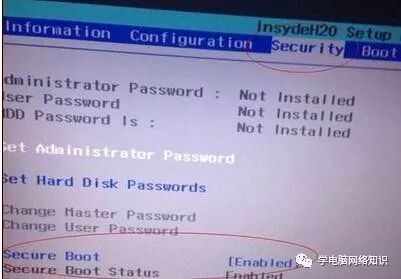 按键盘上下左右键选择各个导航夹,一般在“Security”导航夹内可以找到SecureBoot选项,如下图所示。