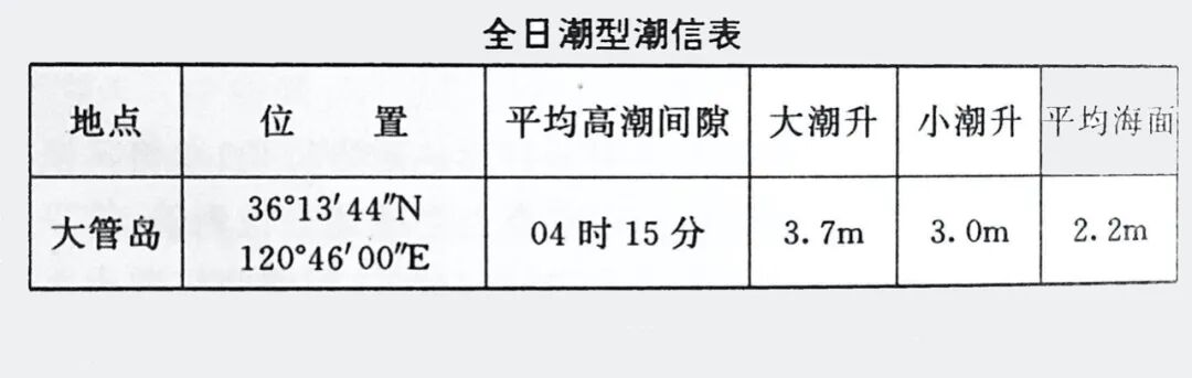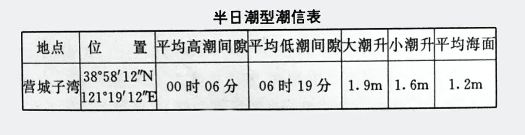 (此段可忽略:潮信表是海图配置的重要要素,提供港站潮汐的基本特征。航海人员使用潮信表可以概略地推算航行海区的潮汐涨落变化情况,并与最新版海图水深配合,求算当时该地海水的实时水深。海图上配置的潮信表是记载某地高低潮间隙、大小潮升、高低潮潮高和平均海面等潮汐特征数据的专用表。不同国家出版的海图有不同的配置形式。)