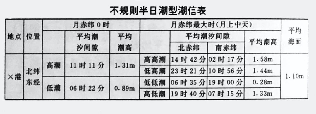 月赤纬为0度或者接近0度时,由表列“月赤纬0度时”的数据计算,其计算式同半日潮型。月赤纬较大时,按表列“月赤纬最大时”的数据计算。