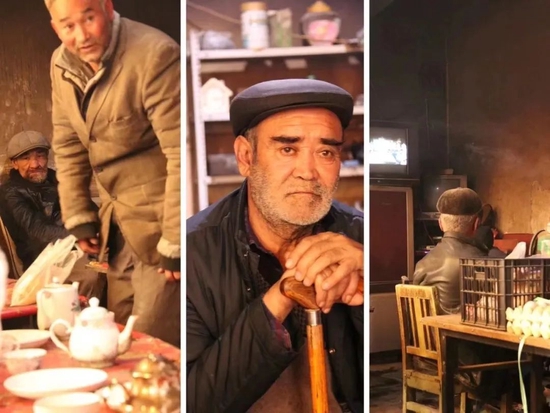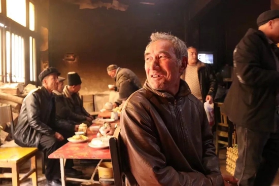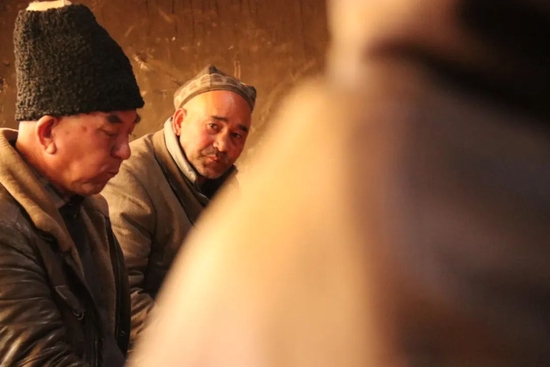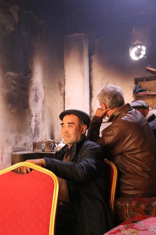 黑洞洞的房间里坐满了黑压压的当地人,全是大叔和大爷,维语交谈声和烟草味儿扑面而来,压迫感瞬间上来了。坐在靠近门口的维族大叔善意微笑,头往里一歪,示意我们可以进去坐坐。