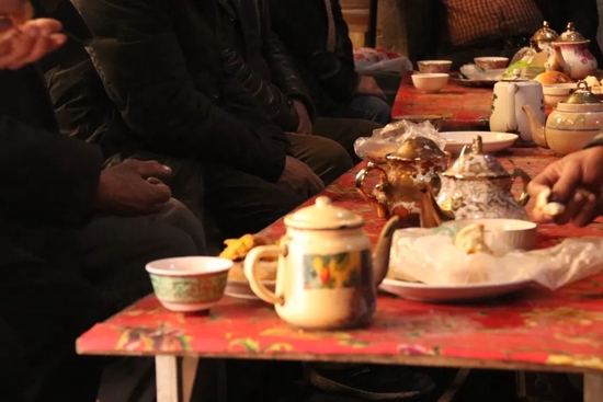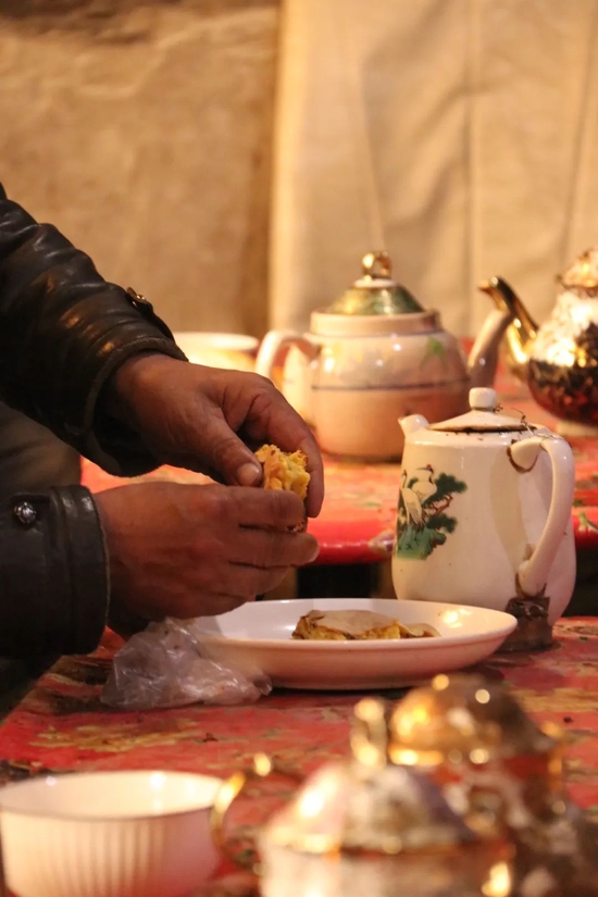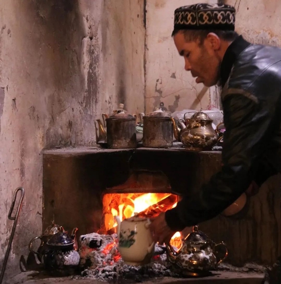 我发现,端茶上桌前,他会用从大锅里新起的热水,把每个茶碗都仔仔细细浇一遍;放下茶壶和茶碗后,他又去给我们拿了一个窝窝馕,这才回到炉灶边坐下。