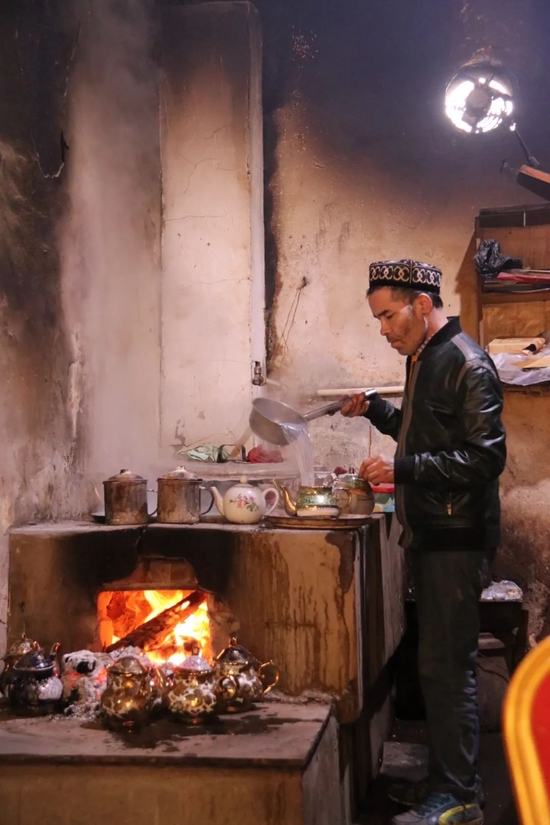 估计是看我们仨坐在那里手足无措,门口的大叔又猜出我们八成也是要喝茶,他用维语喊了下老板,老板看了我们一眼,会意了,开始备茶。