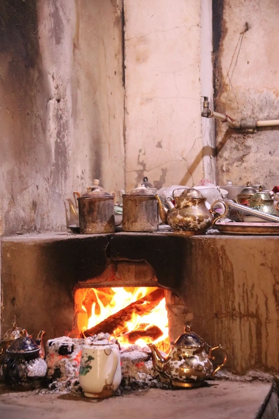 烧水的炉灶就在最里面,红彤彤的柴火在灶眼里燃烧着,热水在大锅上方氤氲出热气,周围的灶台上堆放着图案各异的瓷壶和搪瓷缸杯,釉面上反射着炉火的红光。