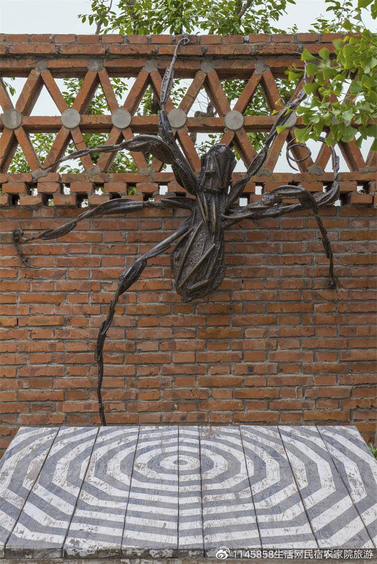 艺术馆院落有叠层石石桌,蛋形装置洗手池、龙溪流水及鱼池,七脚蜘蛛、蛛网茶台及独特的中餐厨房等,随处可见的装饰景观和艺术作品可谓这一空间的灵魂。