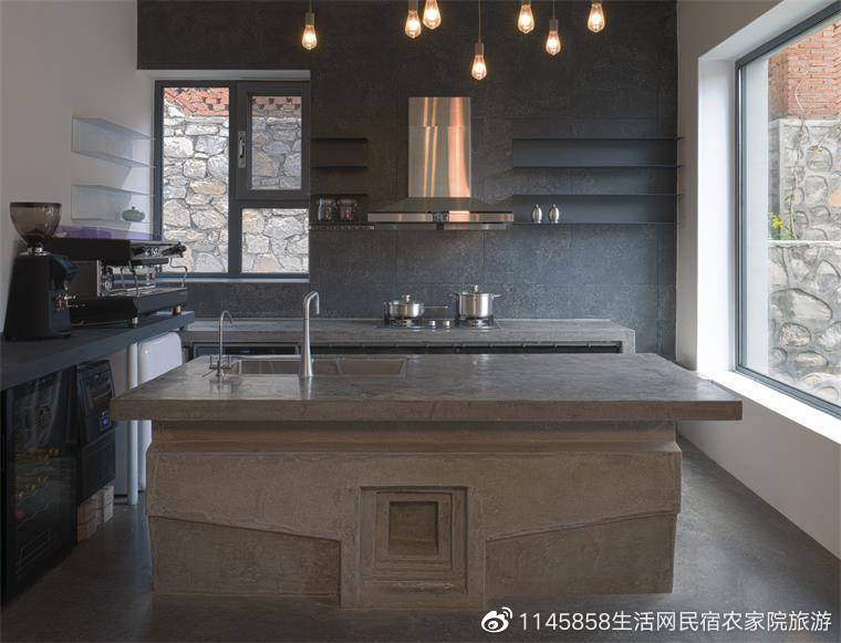 这里有中餐厨房和西餐厨房,配有西门子烤箱、潘多拉咖啡机、磨豆机以及煤气灶、电磁炉等全套烹饪厨具和餐具。宽大的操作台不仅实用,而且是一件艺术作品,名曰:《阿特拉斯(ATLAS)》,希腊神话里阿特拉斯双肩撑起的是悠悠苍天,而我们的阿特拉斯撑起的是一餐美食。