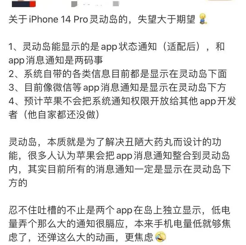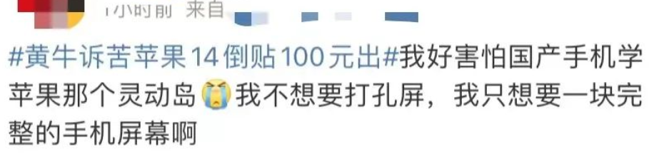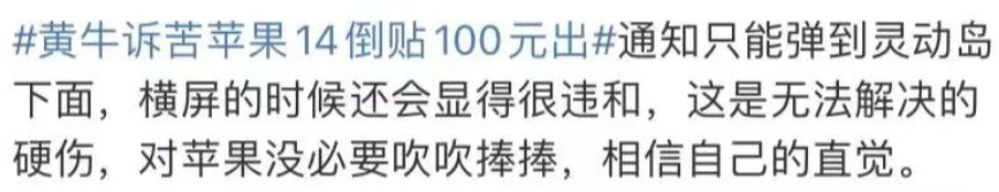 14 Pro,溢价仅400元。 18日上午,#黄牛诉苦苹果14倒贴100元出#话题登上热搜,网友纷纷表示不满,“黄牛扰乱市场秩序,不是可怜人,黄牛不值得同情!” 网友抱怨 “灵动岛不灵动” 据了解,iPhone 14系列最受关注的功能之一是“灵动岛”——iPhone 14将刘海屏化劣势为优势,缩小了“刘海”面积,并以此为中心进行软件交互,可显示后台软件状态,例如正在播放的音乐、倒计时、地图导航等等。灵动岛融合了原有的状态栏、通知等功能,软硬件融为一体,被许多网友视作发布会最惊喜的部分。 不过,在拿到新机后,不少网友表示失望,“灵动岛不灵动”“功能未完善,首批入手似乎也称不上是值得兴奋的事情”,还有不少网友认为灵动岛的功能与期待不匹配。 一位工作人员介绍称,目前苹果自带的一些应用软件,比如音乐和地图已经适配了“灵动岛”的功能,但是第三方应用软件是否能在“灵动岛”内显示,取决于第三方软件的适配情况。 苹果公司已经在今年的开发者大会上,允许开发者基于灵动岛开发相应软件,也包括游戏。 不过从目前“灵动岛”适配的软件来看,种类非常有限,例如微信等功能尚无法在“灵动岛”内显示。工作人员称,再过几个月,当更多的第三方App完成了适配后,“灵动岛”可能会有更好的功能体验。 新机销量难敌13系列? 市值蒸发了1.4万亿 不管黄牛是不是亏哭了,但对于库克来说,确实是实打实的销量。 9月9日晚,苹果开启iPhone 14系列网上预售,由于太过火爆官网被挤崩了。12日晚间,苹果公司的股价上涨3.9%,创下5月27日以来的最大单日涨幅,股价收在163.43美元。 没想到的是,13日晚间,美国8月CPI通胀数据披露,科技股大跌,苹果也没能逃过此劫。9月16日,苹果盘中下探超2%之后,跌幅缩窄,截至收盘总市值2.42万亿,较12日的2.63万亿蒸发了2000亿美元(折合人民币1.4万亿)。 另外,在苹果分析师郭明錤的最新研报中,他表示从目前的状况来看,iPhone 14与iPhone 14 Plus的预购结果比iPhone SE 3和iPhone 13 mini差。 他还称iPhone 14和iPhone 14 Plus的交货时间更短,iPhone 14 Plus是iPhone 13 mini的替代品,但这一款的预售结果明显低于预期,意味着苹果今年针对标准机型的产品区别策略失败。 据财联社报道,Counterpoint副总监Ethan Qi表示,目前,美元汇率的大幅走高、华为新机对于中国高端机市场的影响都有可能影响苹果14系列的销售。 “今年iPhone