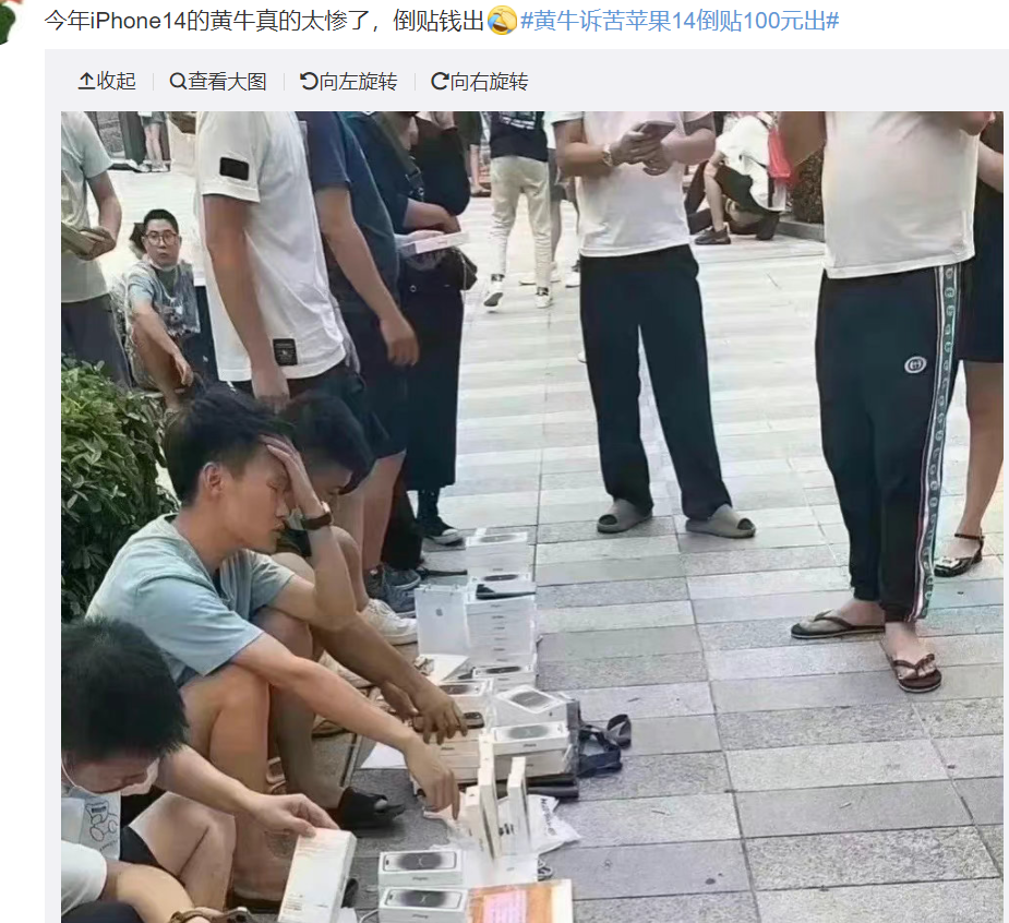 来源 | 北京商报(ID:BBT_JLHD) “现在iPhone卖得不好,前几年一部手机赚五六千,现在你敢留过夜就等着亏本。”一位自称孙哥的黄牛诉苦道。 9月18日,话题#黄牛诉苦苹果14倒贴100元出#冲上热搜。据媒体报道,16日,三款iPhone 14系列机型正式发售,因为不少消费者都想拿到首批机型,iPhone 14货源供不应求。然而首日疯抢的局面仅维持了一天,9月17日,iPhone 14的市场迅速回归冷静,甚至出现破发。 首发即破发 黄牛直呼赔不起 据报道,9月17日,有黄牛在杭州西湖苹果店门前诉苦称,16日加价一千八百元收的iPhone 14 Pro Max,17日只加价600元卖出去了,倒腾了六七台手机,都没有把坑填起来。卖出去六七台,还没有16日一台赔得多。 还有黄牛介绍,国行版iPhone 14,亏100元倒贴出,iPhone 14 Pro加价300元,1T的金色、白色iPhone 14 Pro Max加价500元,黑色和暗紫色加价600元,这是9月17日的行情。 甚至还有黄牛直接问,“14便宜200要不要。” 另据新黄河客户端梳理的湖南一家档口256G内存iPhone