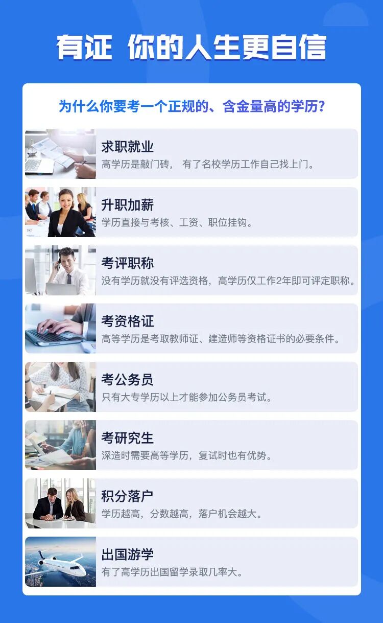为全力统筹地域间教育不均,提高教育薄弱地区本科学历人口数量,保障低学历人员学历提升,特开通本次直升本科报名通道:凡在中华人民共和国居住或工作的公民,不限学历、不限户籍、无需参加高考,均可申请入读知名大学本科学历,免试入学,在职可读,最快1年半后颁发毕业证书、学位证书,国家承认,学信网可查,享受普通院校全日制本科学历同等待遇。提前批次限招100人,报名自愿参加,报名截止至10月11日18:00,招满即止。招生截止日期前无高中学历也可申请,免考高数英语。为响应国家政策,推动全民教育水平提升,全国多所高校启动【助学圆梦计划】:NO.1圆梦助学金:单科(只报大专、本科)申请3000元圆梦助学金。NO.2 本科助力计划:大专以下学历,无前置要求可申请连读到本科的助力计划,补贴4980元本科圆梦金。NO.3 福利赠送:凡新生报名,可享会计,人力,教师等热门资格证,原价4980元,任选一门免费赠送。NO.4 助学通道:若是农村户籍,可申请助学分期入学,报读大专/本科,其余学费咨询相关老师。届时由以上高校颁发本科证、学位证,证书教育部备案,国家承认,学信网可查,求职、升职享受普通高等院校毕业生同等待遇,可考公考编。报名期间成功申请参加大专、本科学历在职学习的人员。☑ 想升职加薪的人:提升学历层次,跳槽、找工作工资更高。☑ 想考公考编的人:成人学历同样能考公考编,成人本科学历可考90%公务员岗位。☑ 想提升层次的人:更高学历可以扩大人脉圈,对相亲、结婚也更有帮助。☑无入学考试:初/高中学历即能报名,不用担心底子差,基础弱。☑含金量高:证书教育部备案,学信网终生可查,毕业后享受普通高校全日制毕业生同等待遇:拿证后可出国留学、积分落户、考研考公、职业资格证考试、升职加薪等等。疫情期间,暂不开放线下报名,转为网上报名,报名流程如下:2、提交个人最高学历毕业证原件、复印件一份(在校生持学生证原件、复印件一份);4、提交一寸蓝底纸质版登记照片一张、一寸蓝底电子版照片(384*512规格,jpg格式);
