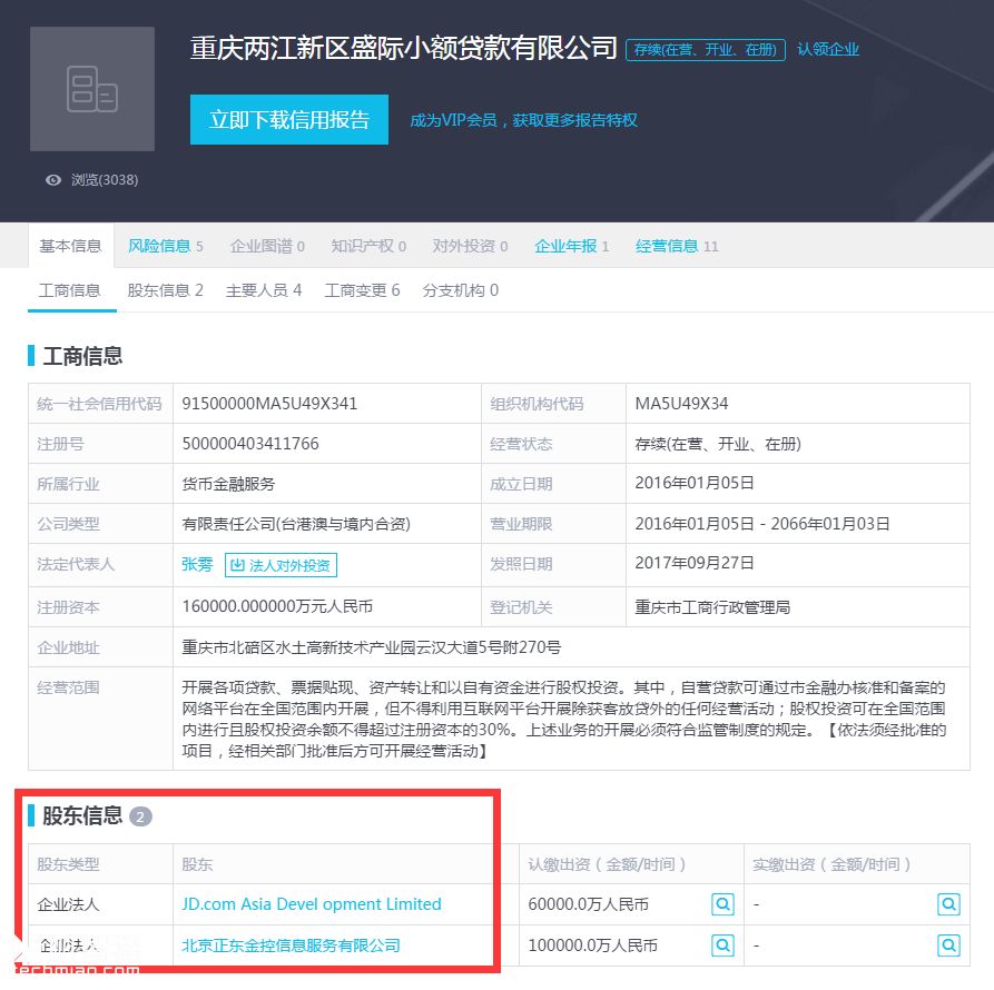 该公司经营范围是:“开展各项贷款、票据贴现、资产转让和以自有资金进行股权投资,但不得利用互联网平台开展除获客放贷外的任何经营活动”,做贷款,是完全没有问题的。而且其股东也是“JD.com”和“北京正东金控信息服务有限公司”,而后者也是京东旗下的公司。