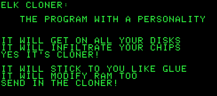 Elk Cloner 是一款通人性的程序,它将进入你的所有磁盘,它将渗透你的芯片。 对,这是克隆! 它会像胶水一样黏住你,也会修改你的内存,不断复制和传播!