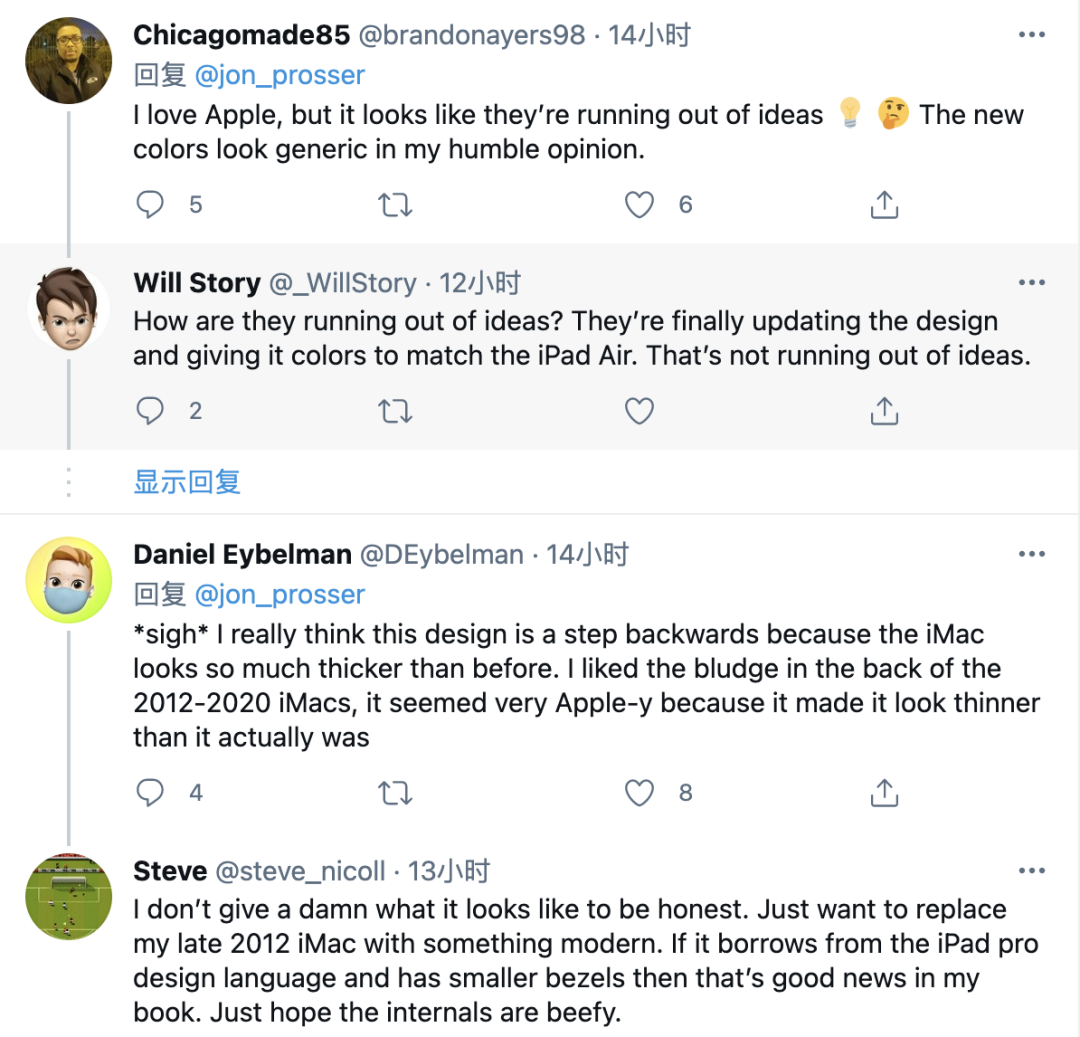 从网友的评论来看,他们对这两款Mac新品的评价基本上是褒贬不一。有部分网友认为,Apple的设计越来越倒退了,居然拿旧的设计出来糊弄人;另一部分网友觉得新款iMac 24英寸的颜色看起来太普通了;还有些网友不喜欢新款iMac 24英寸的边框,与在售的iMac边框相比太厚了。其实Apple的产品设计没有倒退,可能只是想把产品设计统一化。典型的案例有很多,例如iPad Air 4的直角切边和全面屏设计对应iPad Pro;晚iPad Air 4一个月发布的iPhone 12系列,同样采用了直角切边设计。哪怕是尚未发布的Apple Watch 7,从网上曝光的渲染图来看,它也采用了相同的直角切边设计。种种迹象表明,Apple正在悄悄地进行产品设计ID的大一统。事实上,如果你经常关注Apple产品的话,应该不难发现,不管是哪条产品线,它们的设计基本上都保持着高度的统一。举个例子,目前Apple官网在售的iMac外观设计,Apple用了八年没变过。又或者是iPhone 6的圆润倒角设计,直到去年iPhone 12才改用圆角切边。仔细对比你会发现,以前Apple产品设计的统一,是单一产品线的外观保持一致,例如自Apple Watch诞生以来,外观设计一直没有变化;2010年,Apple发布首款MacBook Air后,楔形设计一直被沿用至今;iPad和iPad mini的外观一直都是宽额头+大下巴等。而现在你可以在不同产品线找到相同的设计元素,好比iPhone 12、iPad Air 4采用了相同的圆角切边设计。用一句话概括:Apple或许想要统一所有产品的外观设计。除产品外观设计外,Apple还试图想要打通不同系统间的壁垒,实现真正的软件互通。得益于自研芯片和Apple生态,搭载M1处理器的三款Mac产品已经可以直接运行iOS/iPad上的应用,甚至可以使用Mac玩手游,不需要下载安装任何模拟器。这是Apple做的系统层面的统一。说句大实话,其他厂商很难做到产品设计和不同系统的统一,原因在于Android厂商每年都会多出很多款产品,而且产品线也比较多,如果所有产品设计都一样,不仅会缺乏竞争力,还会被用户吐槽不用心做产品。而打通不同系统的墙壁更是难上加难,因为Android本身是开放系统,再加上其他厂商推出的电脑搭载都是Windows 10,而且采用的也不是自研芯片,所以很难实现不同系统的互通。崇尚简约和统一的Apple