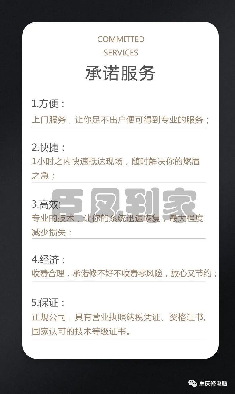 还在为不知道去哪儿修电脑感到烦恼?【臣凤到家】专注于全城的企业、公司、医院、学校、家庭、大型超市等单位的、外包服务、电脑维修上门服务。 全国连锁上门修电脑,24小时上门维修,专业又靠谱,大品牌公司团队服务,重信誉,童叟无欺,上门现场维修绝不忽悠客户,或偷换客户电脑硬件! 专业上门维修各种电脑故障:装系统、做系统、电脑系统、换系统 更换配件、密码解除、病毒查杀、系统病毒杀毒、查杀、无法开机、不开机、开机无反应、黑屏、电脑系统故障维修系统问题维护、电脑风扇噪音大、上门服务、修好收费、不成功不收费! 重庆全市区覆盖、快速上门、就近安排师傅上门检测维修,随叫随到,上门服务,修电脑,认准【臣凤到家】,专业又靠谱! 联系电话:13480795550 点击这里 关注公众号即可预约下单 一、常见IT故障维修上门 网络维护、网络工程、网络维护、网络异常、线路异常、线路检测、计算机无法接入互联网、局域网无法共享、 手机可以通过WiFi接入互联网、计算机无法接入互联网。移动wifi无法连接,移动wifi无法连接到互联网。计算机可以接入QQ 不能接入互联网,打印机共享,局域网建设,局域网调试,网络布线监控工程,路由器安装,WiFi调试,AP覆盖 企业路由安装调试,上门服务可以快速解决问题。桌面电脑提供MAC系统服务 开机无反应、开机黑屏、开机出错、开机报警、开机速度慢、花屏、蓝屏、散热、死机、重启自动关机、自动重启、异常死机 台式机故障、电脑组装、攒机、免费提供装机方案、键盘按键失灵、对话框报错、桌面打不开、速度慢、麦克不能用、硬盘打不开 笔记本花屏、掉电、断电、重启、无法安装操作系统、不认硬盘,解BIOS密码、笔记本接口维修 电池问题 端口问题 组装升级 主板更换 更换屏幕 游戏本 轻薄本 配件更换:主板 液晶屏 外壳 屏轴 屏线 键盘 内存 硬盘 光驱 触摸板 电池不充电 电源 显卡 上网卡 二、其他故障维修上门 电脑维护软件维护系统安装、系统差异与修复、病毒检测与杀灭、服务器维护系统启动丢失 分区错误、软件错误、办公软件安装、数据恢复、,硬盘删除区和苹果系统安装 硬件检测、硬件维护、计算机无法打开、蓝屏无法打开、系统无法进入、引导错误代码、摄像头无法打开、引导没有响应 引导屏幕是黑色的、引导速度慢、自动关机、自动重启、异常崩溃、主机泄漏、计算机花屏、鼠标和键盘没有响应 声音不响,光驱不正常、笔记本电脑维护、笔记本电脑电源故障、启动后声音异常、启动温度高、无法进入系统 笔记本电脑硬盘路径不良、post故障、BIOS接口卡滞、笔记本电脑异常崩溃、笔记本电脑外部接口异常、键盘故障、触摸故障 我们都是一线品牌,售后方便。电脑组装、办公电脑、游戏电脑、家用电脑、品牌电脑,我们竭诚为您服务,让您放心购买、舒适使用! 本店装配的所有电脑均为全新机器,硬件保修期为三年! 接到报修电话1小时内到达现场,较快30分钟内到达。 如实告知故障原因,不欺骗顾客,不乱收费。