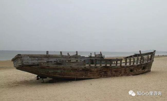 整幅画的气氛有些悲凉的,凄清的海边停泊着一只木船,还有退潮之后留下破旧的船桨随意的搁在沙滩上。