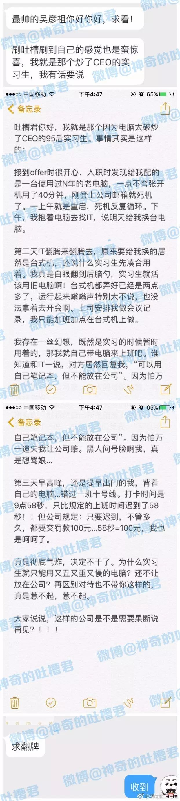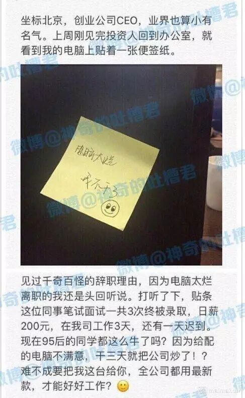 大概就是一个CEO发文说自己公司来了个实习生,因为电脑太慢而决定不干了,而CEO发文吐槽了一下。