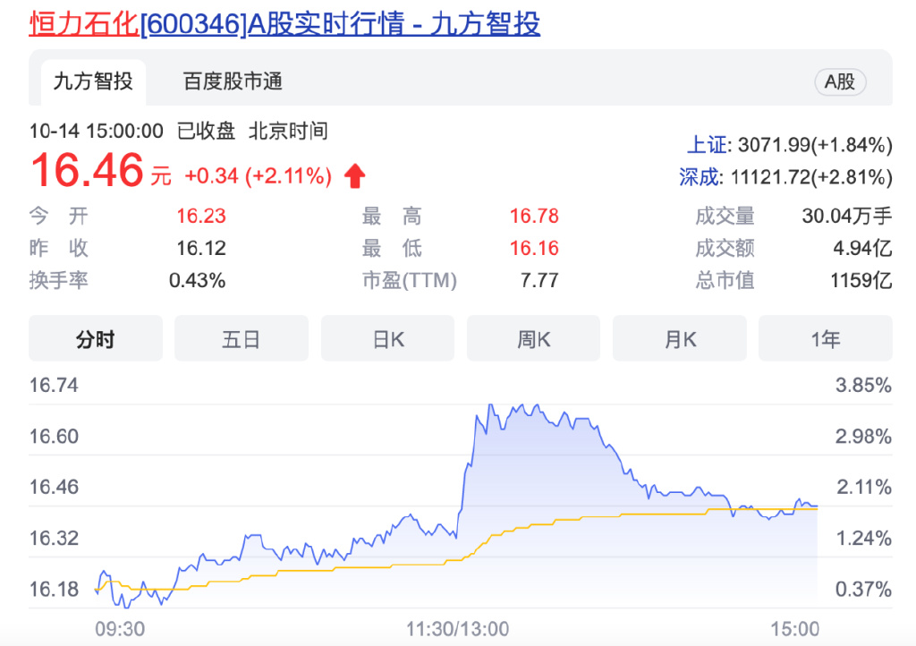 截至10月14日A股收盘,恒力石化股价为16.46元/股,总市值为1159亿元。(北京时间财经 向雨)