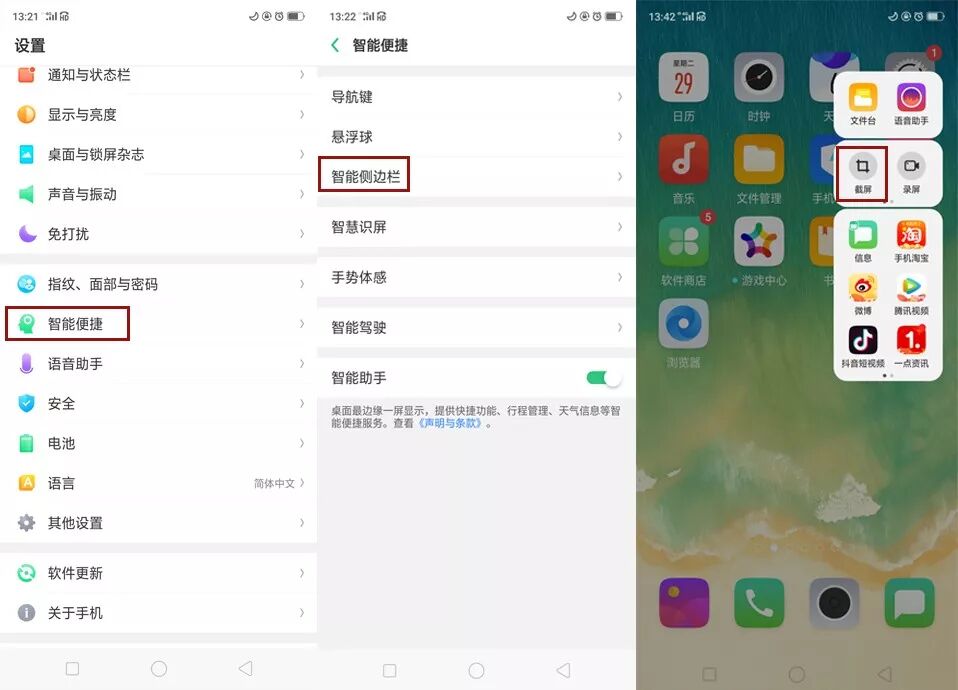 操作方式: 设置-智能便捷-智能侧边栏-截屏智能侧边栏打开后在界面左滑会有截屏图标,这种截屏方式需要ColorOS 5.2以及以上版本才可以支持哦~
