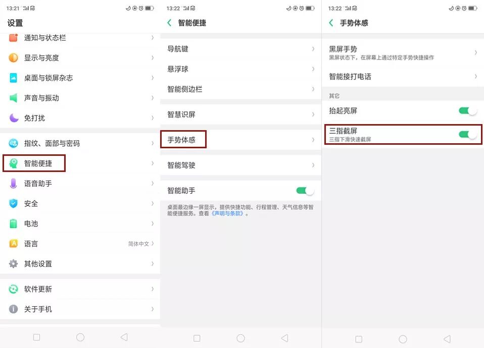 操作方式:设置-智能便捷-手势体感-三指截屏