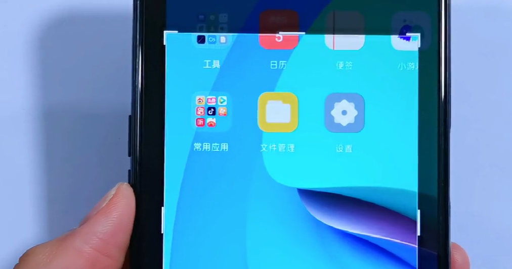 接下来给大家分享矩形截屏的方法,我们用三根手指在屏幕上停留三秒往下滑,可以看到,它就实现了矩形截屏了。我们还可以拖动这个矩形边缘去调整它的大小,它的宽度以及它的高度,调整到合适的位置上之后,我们就可以点击右上角的对勾,它就会保存到相册中了。