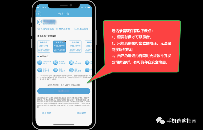 说明:该方法有以下几个缺点:1,这类软件通常都是收费软件,需要付费才可以进行录音。2,只能录制拨打出去的电话,无法录制接听的电话。3,自己的通话内容同时会被软件开发公司所监听,有可能存在安全隐患。