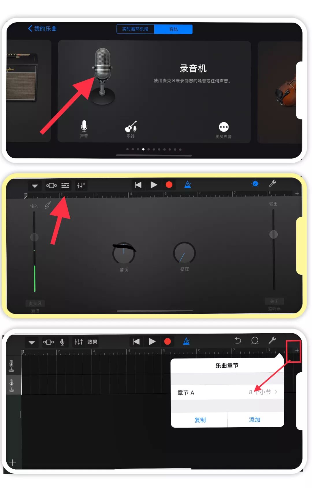 第四步,打开捷径找到刚刚保存的iPhone换铃声捷径,点击点击捷径,跳转到库乐队,在录音机页面点击麦克风,再点击左边第三个选项,在这里需要注意的,我们需要再点击右边一个“+”,把章节时常的自动按钮打开。