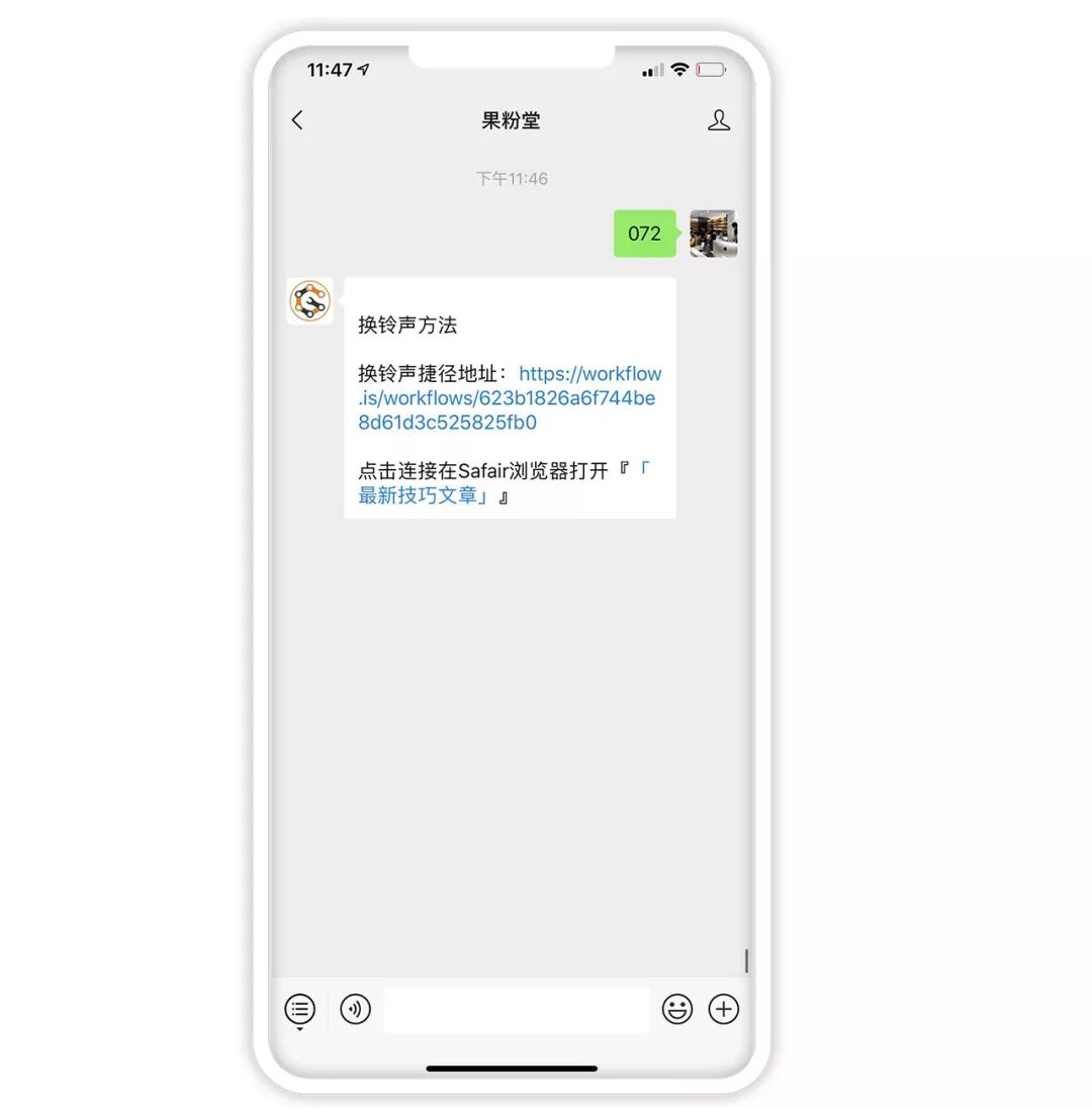 第一步,获取更换铃声的快捷方式,在果粉堂公众号回复数字「072」即可。