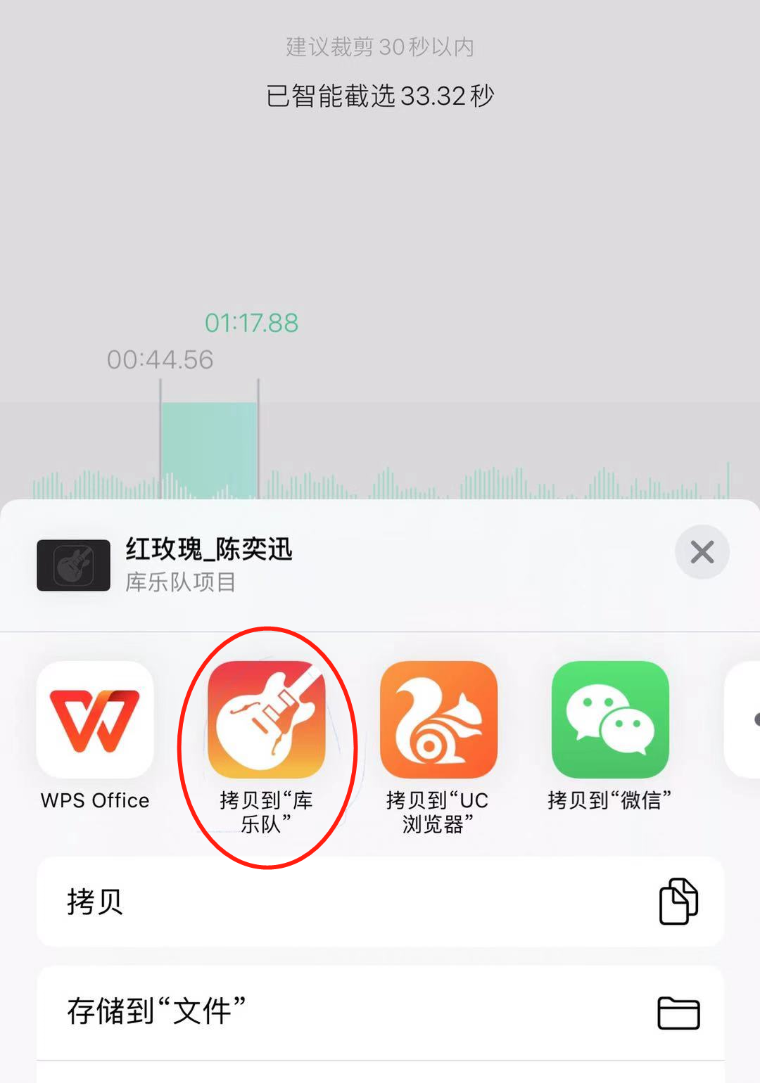 4、截选完以后,点击下方的【设置为铃声】,在打开的页面下选择拷贝到【库乐队】。