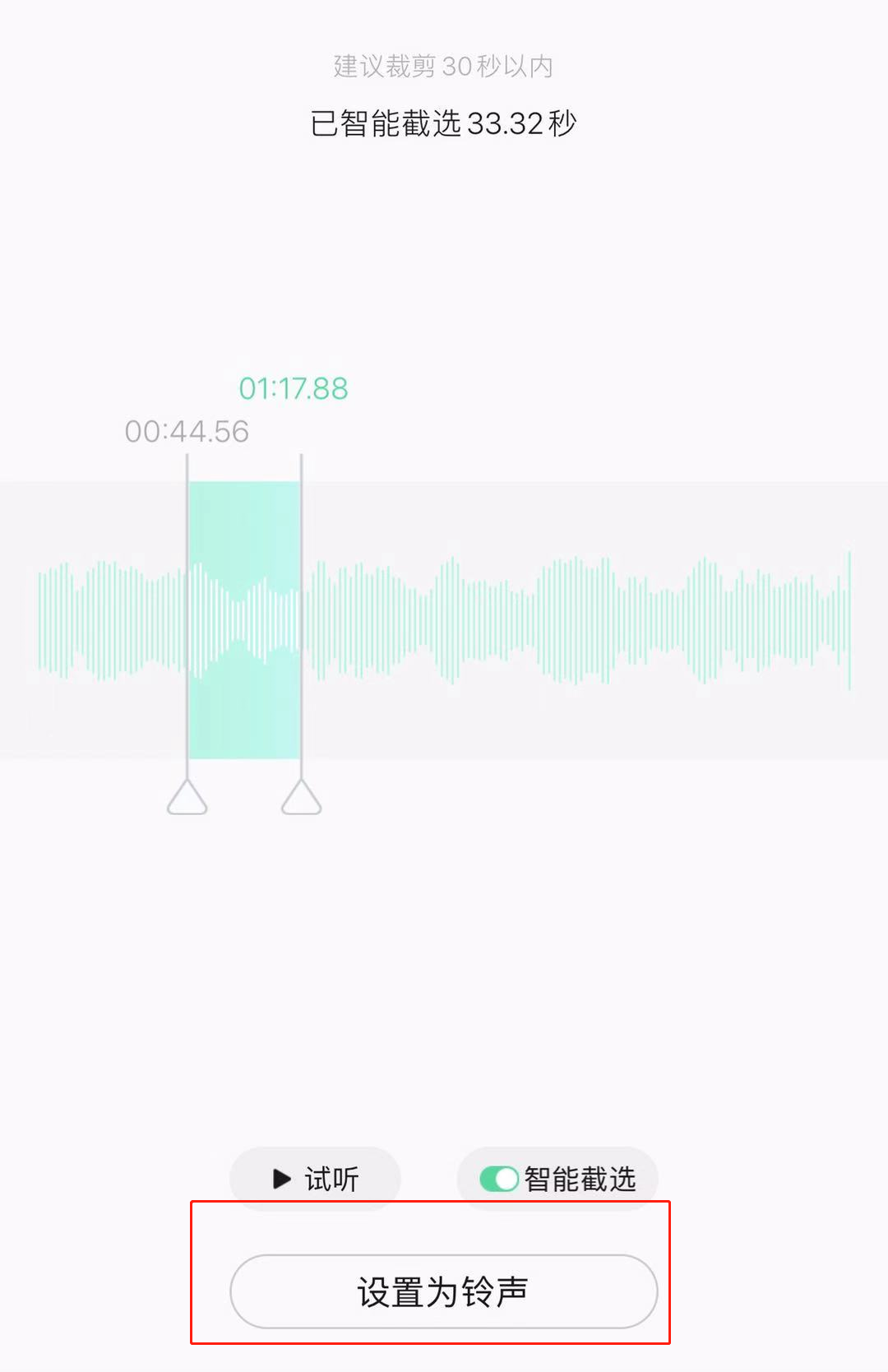 3、随后,就进入到铃声智能截选页面,也可以自定义截选自己喜欢的片段,一般是在40秒以内。