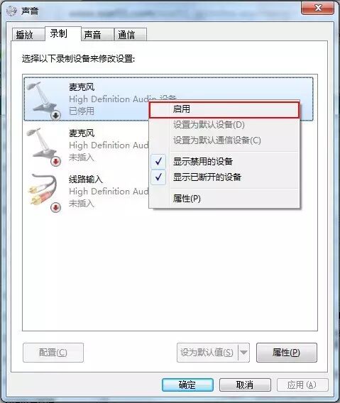 如果出现被停用的麦克风,再右键点击【麦克风】,选择【启用】即可。