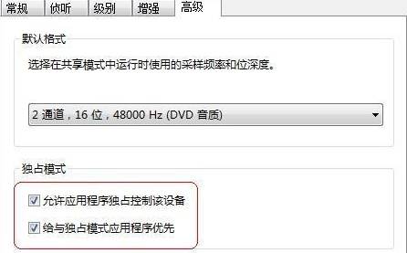 最后再在“高级”中,把【独占模式】里的两个选项勾选,点“确定”即可。