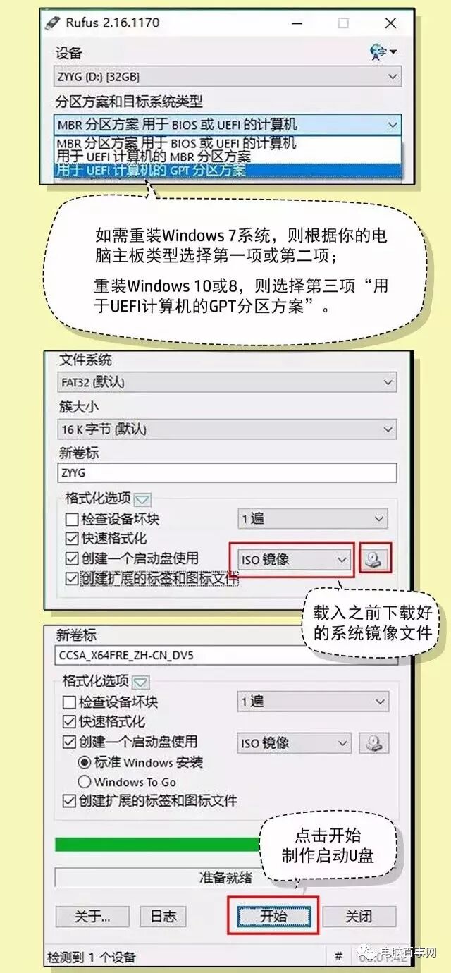 第三步,将系统镜像写入启动U盘。可以在百度搜索“Rufus”下载该镜像写入软件,双击运行该软件制作启动U盘。如果需要重装Win7,根据电脑主板类型选择第一项或第二项。如果重装Win8或Win10,则选择第三项“用于UEFI计算机的GPT分区方案”。