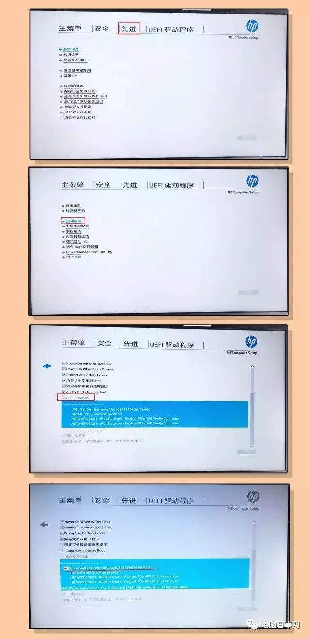 进入Bios设置之后,找到Advance(先进)点击“启动选项”,然后下滑到“UEFI引导顺序”,设置U盘为第一启动项,如下图所示。