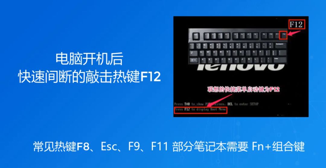 6、电脑开机后马上敲击启动热键F12,一般是F12、F8、F9、F11、ESC,都可以逐一尝试,一般开机后屏幕下方有几行英文,可以看到启动热键提示。