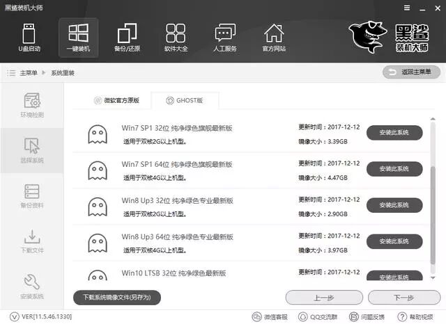 2、黑鲨装机大师提供了多种版本的系统,选择你需要安装的系统版本,然后下一步。