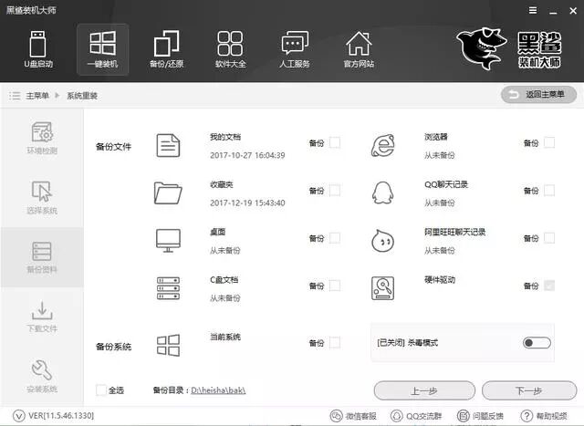 1、打开运行黑鲨装机大师软件,打开前先关闭所有的杀毒软件,否则可能出现各种神奇的问题。打开一键装机界面,在这里选择系统重装,会检测环境,完成后点击下一步。