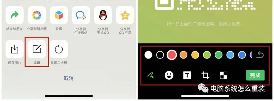 除此之外,点击二维码界面右上角三个点的图标,还可以对二维码进行编辑,支持涂鸦、添加表情、裁剪等多种功能,编辑完成记得点击“完成”按钮保存图片哦。