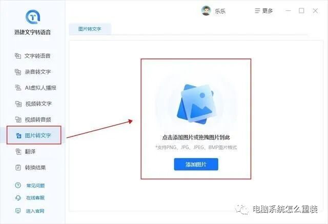 【操作方法】:打开软件,选择“图片转文字”功能,点击“添加图片”按钮上传图片。