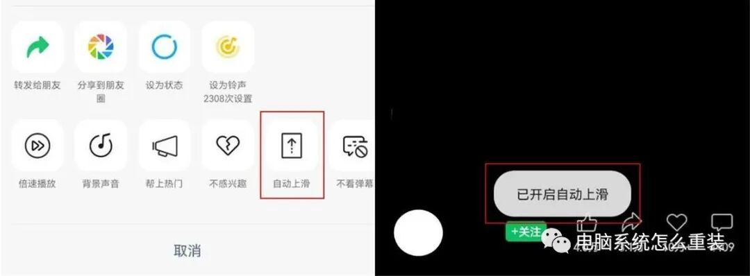 在旧版本中,观看完一个视频,需要手动去滑动操作,现在新版本支持自动滑动了。长按视频,在跳出的界面中选择“自动上滑”功能,即可开启视频自动上滑。