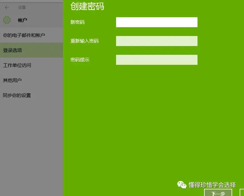 第四步、选择密码选项,还没有设置密码的会提示设置新密码,已经设置过密码的显示“更改”选项,可以更改密码。