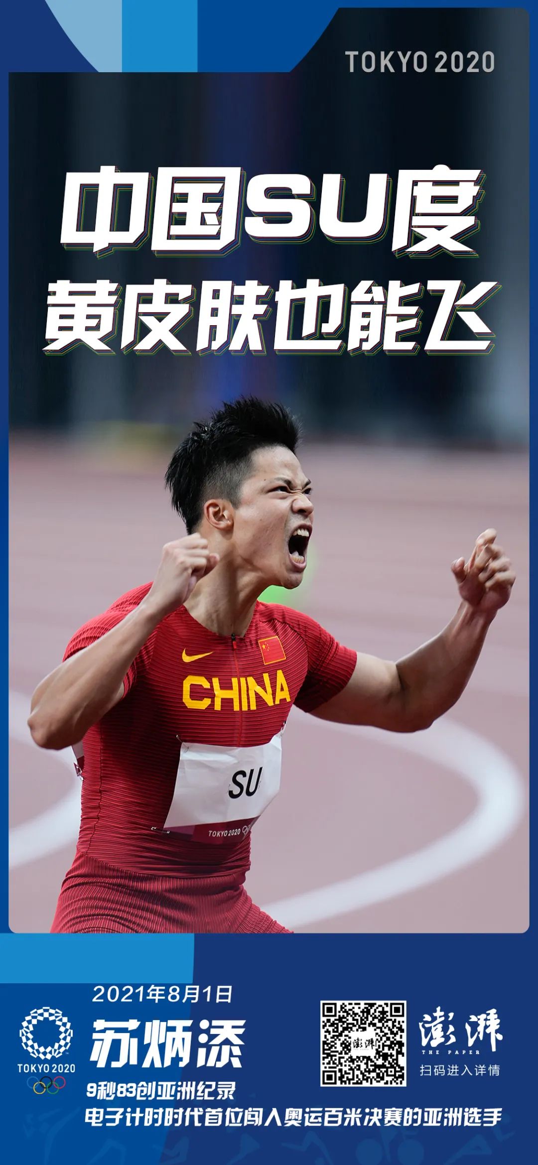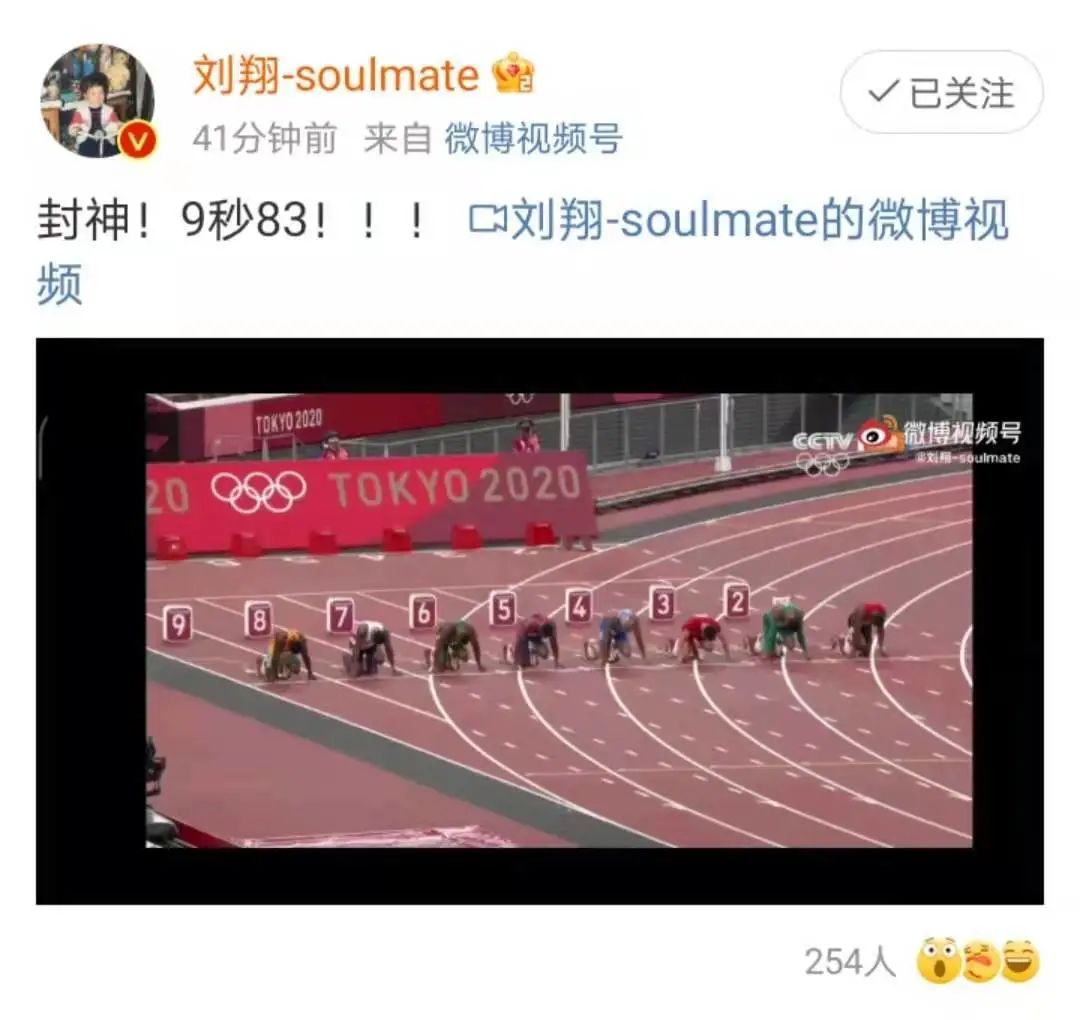 第一枪预赛10秒05,第二枪半决赛9秒83打破亚洲纪录!成功晋级决赛!成为电子计时时代第一位闯入奥运百米决赛的亚洲选手!晋级后的苏炳添忘情怒吼,他已经创造了黄皮肤的历史!创造了中国人的传奇!2小时后,苏炳添又站上了百米决赛的赛场——这个瞬间,永远值得所有国人铭记。赛后,刘翔在社交媒体发文祝贺苏炳添——“封神!9秒83!!”