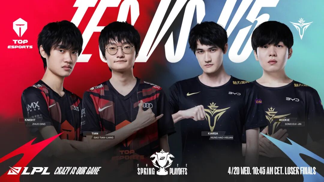 最能体验这一点的莫过于最后两场比赛,V5连续两把帮Karsa抢到了盲僧,但面对小天的佛耶戈和狗熊,Karsa没能再像之前一样串联起全队的节奏,第三局河道一波失误直接葬送全局,第四局野区跟狗熊硬刚更是上头行为。他的不稳定直接让中路的Rookie变成了“地缚灵”,在上下野都处于劣势的情况下,Rookie只能通过无脑刷线拖后期来尝试拯救队伍,但很可惜,滔搏没有给他机会。