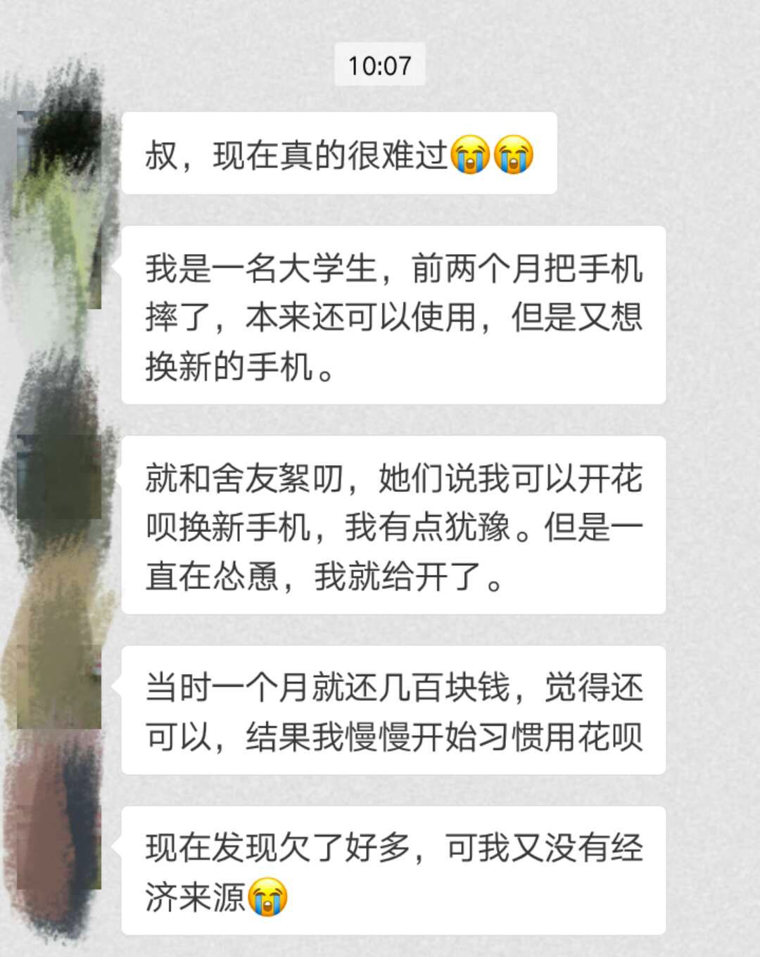 她说,在舍友的怂恿下开通了花呗,换了新手机,没想到渐渐习惯使用花呗,于是越欠越多,可是自己又没有经济来源。