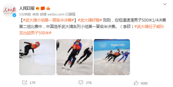 此前,@人民日报 微博消息,在短道速滑男子500米1/4决赛第二组比赛中,中国选手武大靖名列小组第一晋级半决赛。