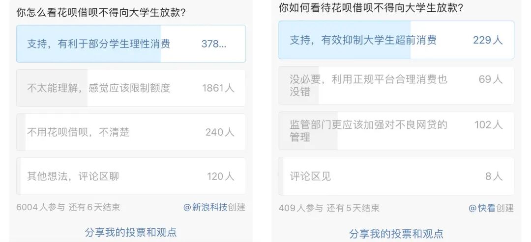 除了大学生之外,在公众范围内,对大学生是否可以使用花呗、白条的态度也莫衷一是。在多个微博投票中,支持大学生使用花呗的人数占到了三分之一,有着较为广泛的舆论基础。